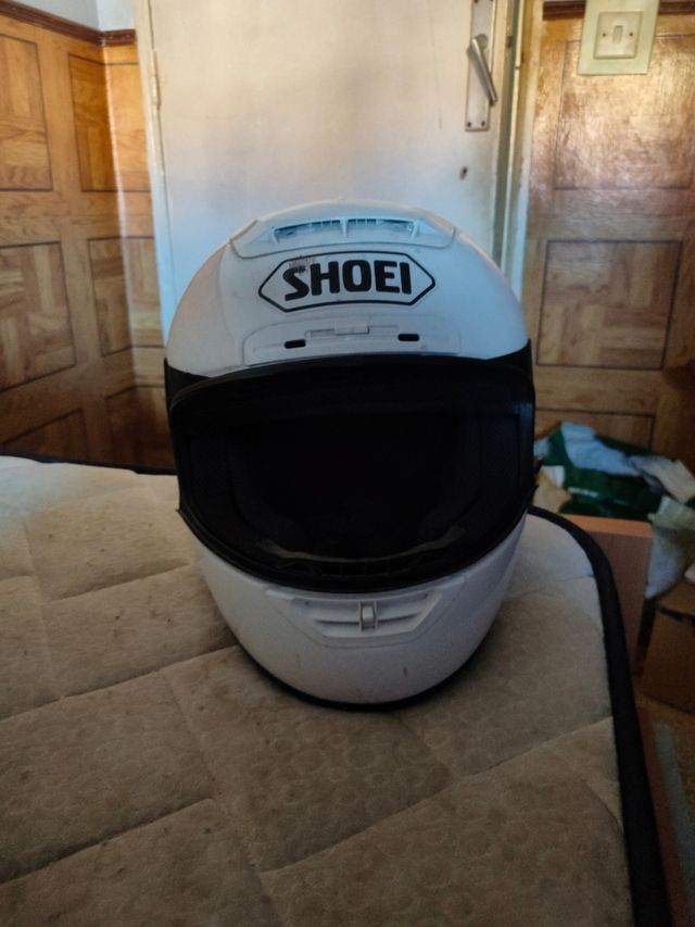 Casco de moto de la marca SHOEI en color blanco. Diseño aerodinámico y visor oscuro. - Marca: SHOEI - Color: Blanco - Visor: Oscuro Escucho ofertas