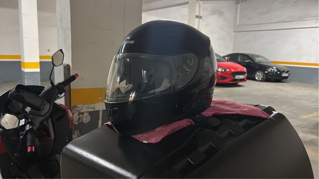 Casco de moto integral en talla XL. Diseñado para ofrecer protección y comodidad. - Color negro brillante. - Visera transparente. - Interior acolchado.