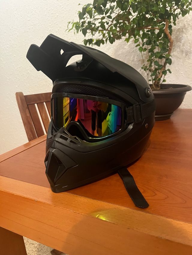 Detalles del productoCasco de moto negro con un diseño moderno y gafas incluidas.