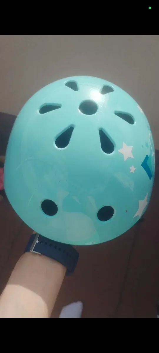 Detalles del productoCasco de protección para patinaje o ciclismo, en color azul claro con divertidos diseños de estrellas.