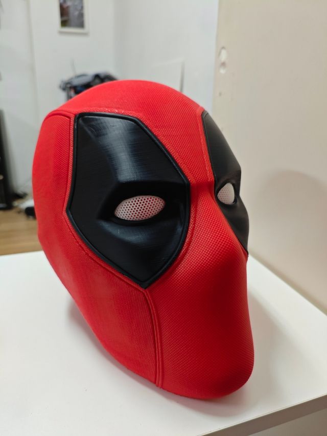 Casco Deadpool a tamaño real. Impreso 3D y sujeccion mediante imanes.
