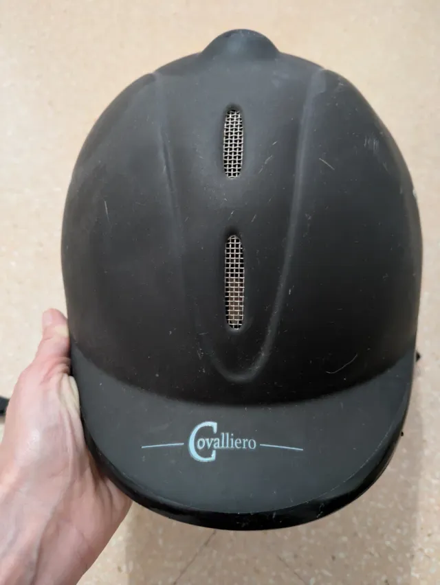 Detalles del productoCasco de equitación de la marca Covalliero, talla 52-55cm para niños y niñas, de color negro, con dibujos en azul en los laterales. En muy buen estado.