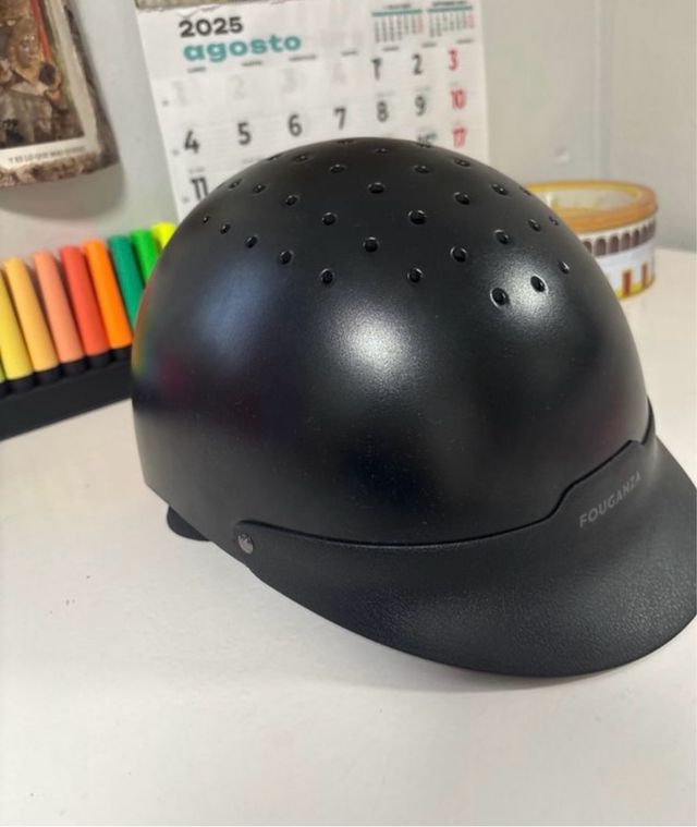 Casco de equitación Fouganza en color negro. Presenta un diseño moderno con múltiples orificios para ventilación.