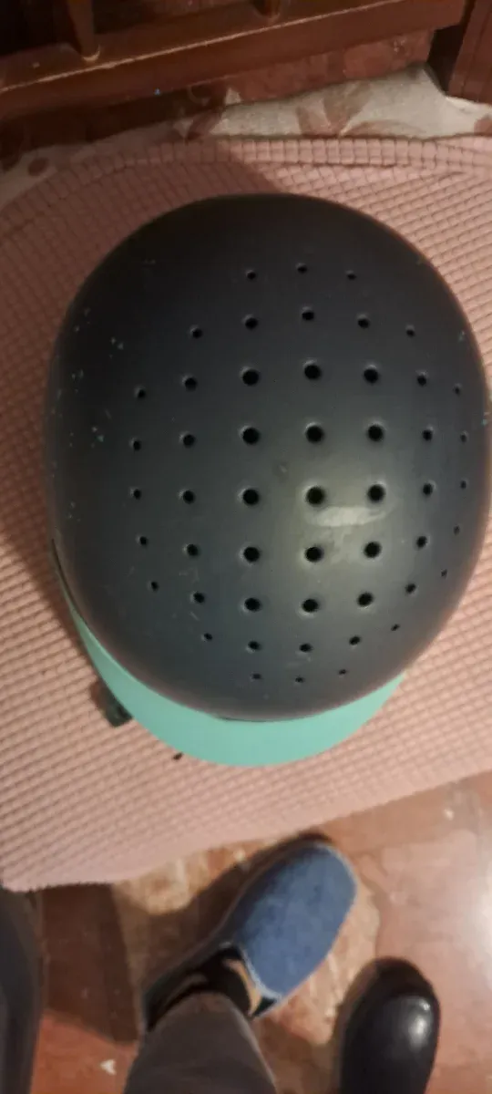 Casco de equitación para niña, con un diseño moderno y ventilado. - Color gris oscuro con detalles en turquesa. - Múltiples orificios para ventilación.