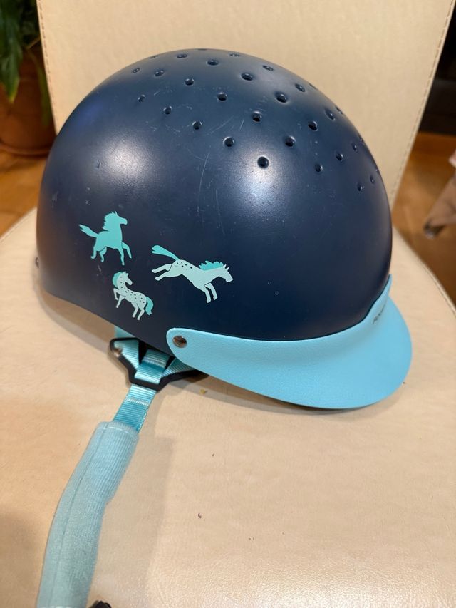 Detalles del productoCasco de equitación en talla S, con un rango de ajuste de 55 a 58 cm. Presenta un diseño en color azul marino con detalles de caballos en color turquesa.
