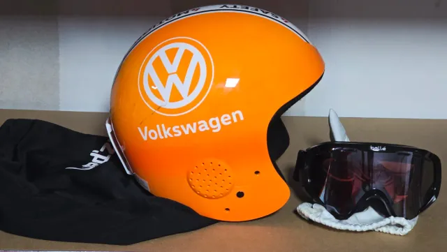 Detalles del productoCasco de esquí Eassun con diseño de Volkswagen en color naranja, usado pero en buen estado como se ve en las fotos