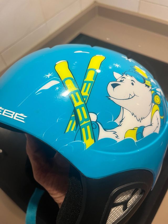 Casco de esquí infantil de la marca CEBE, con un divertido diseño de oso polar y esquís. - Talla: 51-53 cm. - Color: Azul. - Diseño infantil.