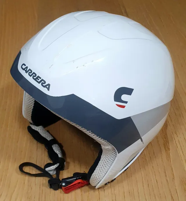 Detalles del productoCasco de esquí para niño de la marca Carrera. Diseño en color blanco con detalles en gris y azul.
