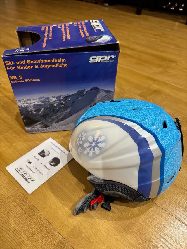 Detalles del productoCasco de esquí y snowboard GPR para niños y jóvenes. Diseño azul con detalles blancos y copos de nieve.