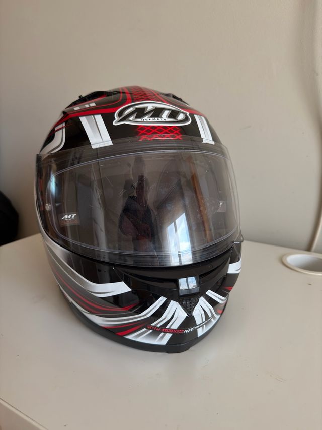 Casco integral Helmet Arai MT de talla M con diseño deportivo. - Color negro, rojo y blanco. - Visera transparente. - Cierre de seguridad.