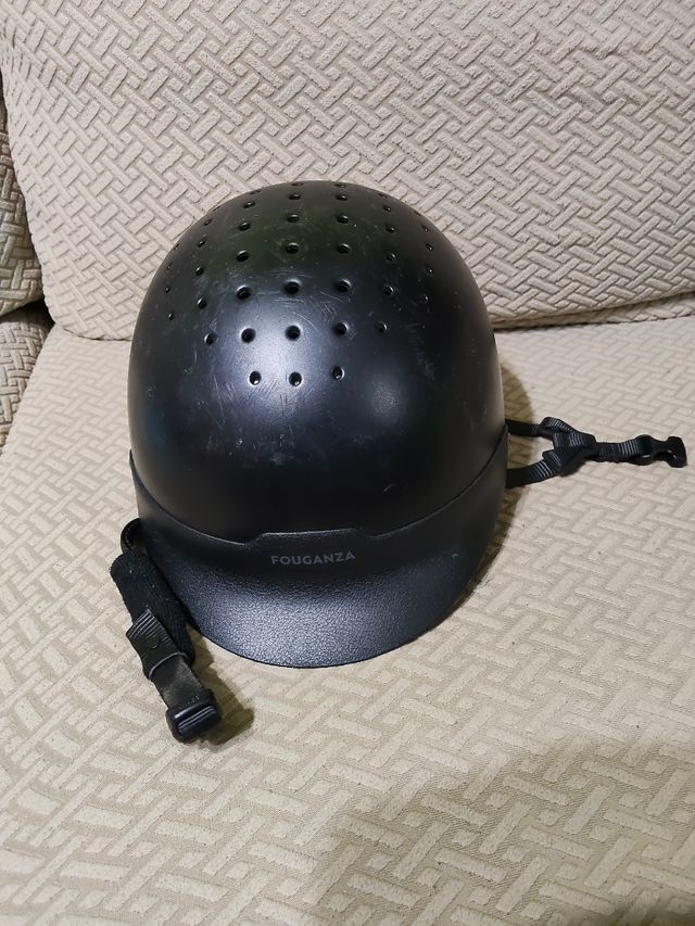 Casco de hípica Fouganza, en buen estado. Es de color negro y tiene agujeros para la ventilación. Incluye una correa para la barbilla. Ideal para montar a caballo.
