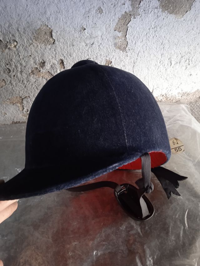 Casco de hípica de estilo vintage. Un accesorio clásico para la equitación. - Exterior de terciopelo. - Interior en color rojo. - Correa de ajuste con cierre.