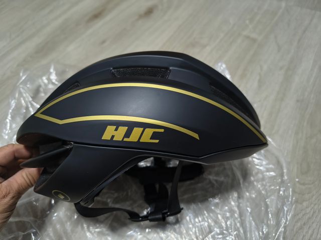 Casco de ciclismo HJC en color negro con detalles dorados. - Diseño aerodinámico. - Marca HJC visible.