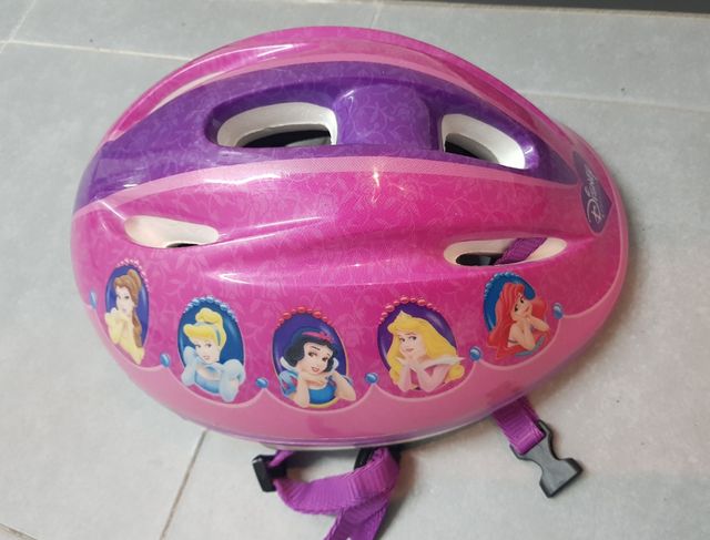 Detalles del productoCasco para niñ@s tamaño 52_56cm. Ajustable a la cabeza mediante en la parte de atrás. En tonos morados y rosas con princesas de Disney. Almohadillas internas íntegras y broche perfecto. Muy poco uso.