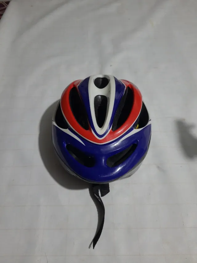 Casco de protección para niños con un diseño deportivo y llamativo. - Colores: azul, rojo y blanco. - Diseño ventilado con múltiples aberturas.