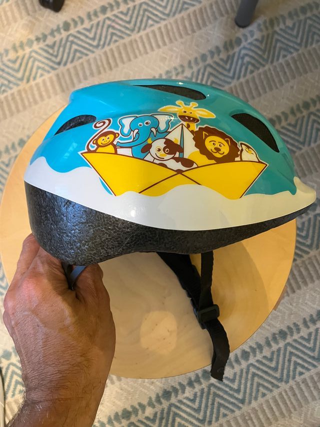 Casco infantil con diseño de animales. - Color azul con ilustraciones. - Correa ajustable para mayor seguridad. - Diseño pensado para niños.