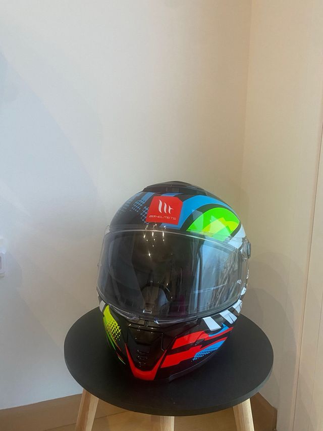 Detalles del productoCasco integral de la marca MT Helmets, sin estrenar. Diseño moderno y llamativo. - Talla: S - Color: diseño multicolor - Visera transparente incluida y gafas de sol integradas - Interior cómodo y acolchado