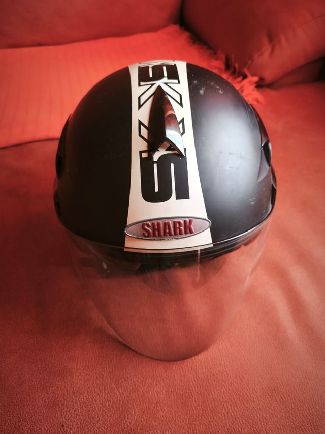 Casco jet de la marca Shark, ideal para trayectos urbanos. Talla xs para cabezas pequeñas. Le faltan los embellecedores de atras