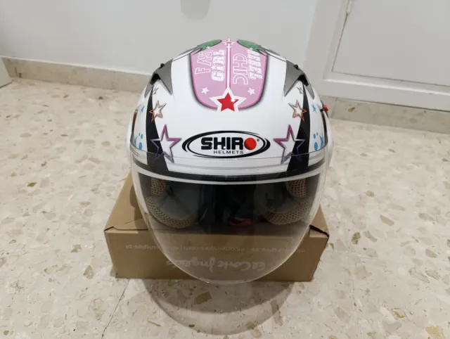 Detalles del productoCasco jet SHIRO con un diseño divertido y juvenil. Presenta un fondo blanco adornado con estrellas de colores y detalles en rosa.