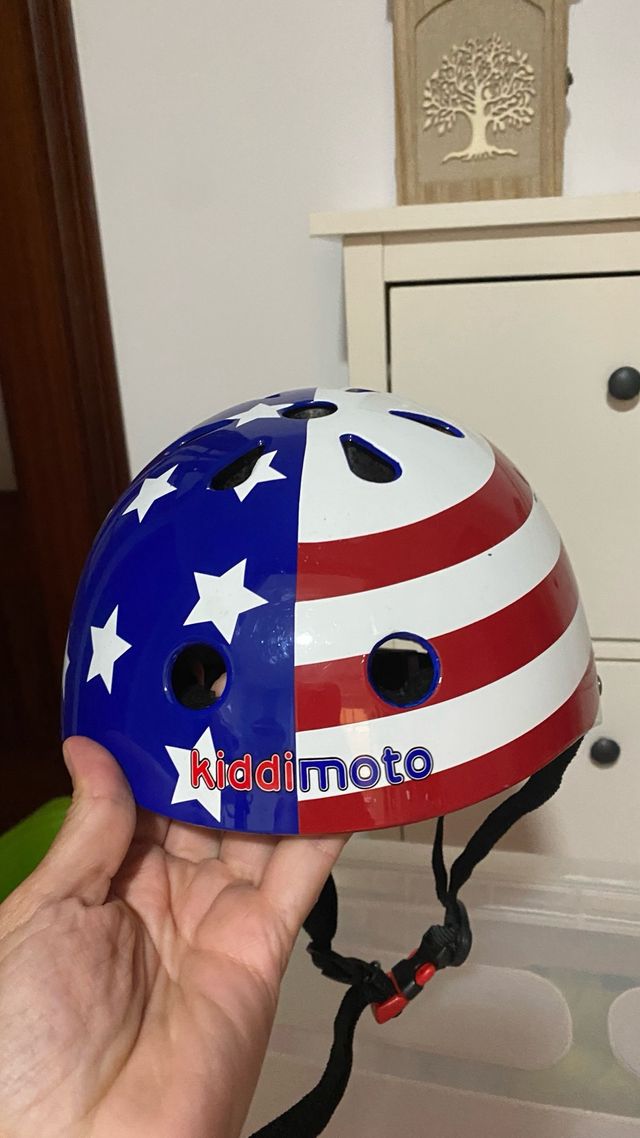 Detalles del productoCasco de bicicleta Kiddimoto para niños, con diseño de bandera de Estados Unidos. Está en buen estado.