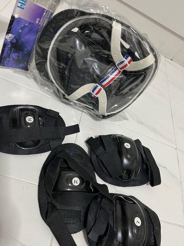 casco nuevo en su embalaje y rodilleras y coderas sin usar