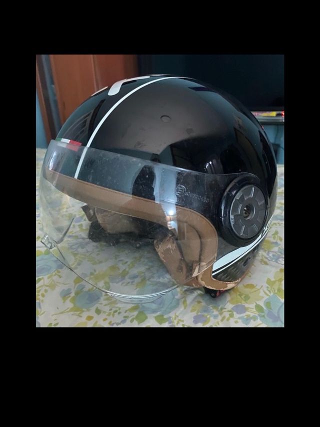 Casco de moto estilo jet, color negro brillante con detalles blancos y una franja tricolor italiana. Marca Xenon - Visera transparente.