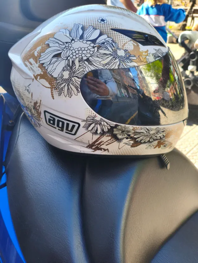 Casco de moto AGV con un diseño floral blanco y dorado. - Estilo para scooter. - Combinación de colores blanco y dorado.