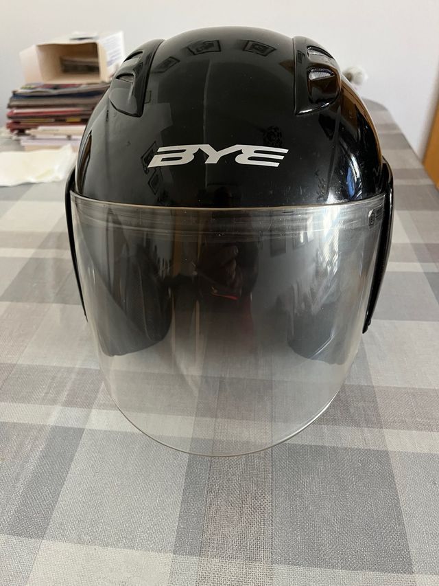 Casco de moto de la marca BYE en color negro y talla M. Cuenta con una visera transparente. Modelo BYE. Color negro. Visera transparente. precio 20€