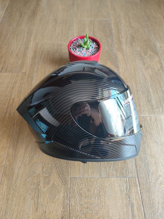 Detalles del productoCasco de moto integral, talla L, color negro pintura carbono. Está Nuevo a estrenar