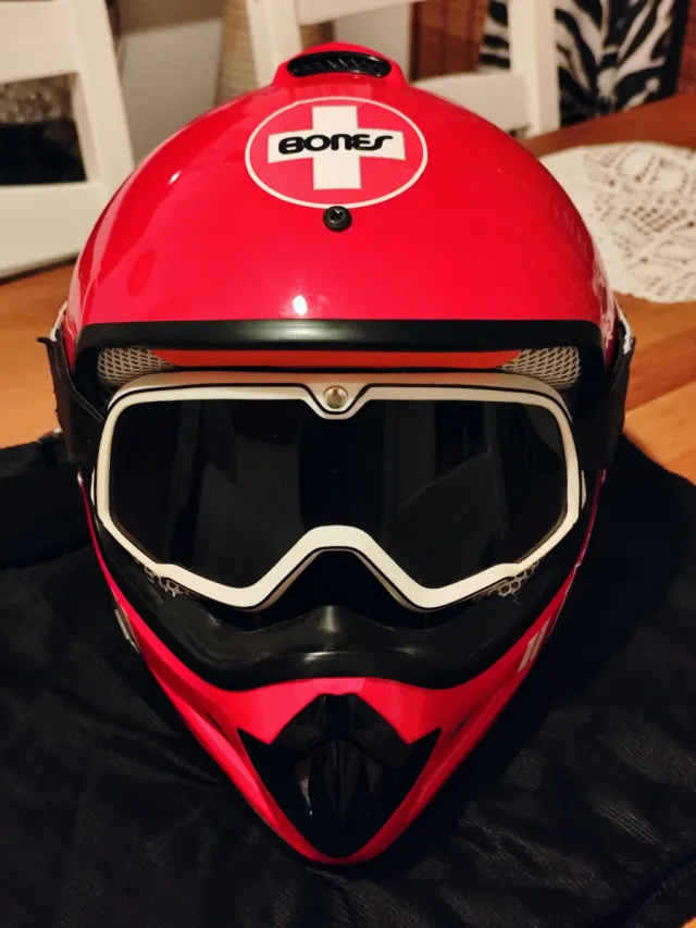 Detalles del productoCasco de moto para enduro o quad en color rojo, con diseño llamativo y gafas incluidas.