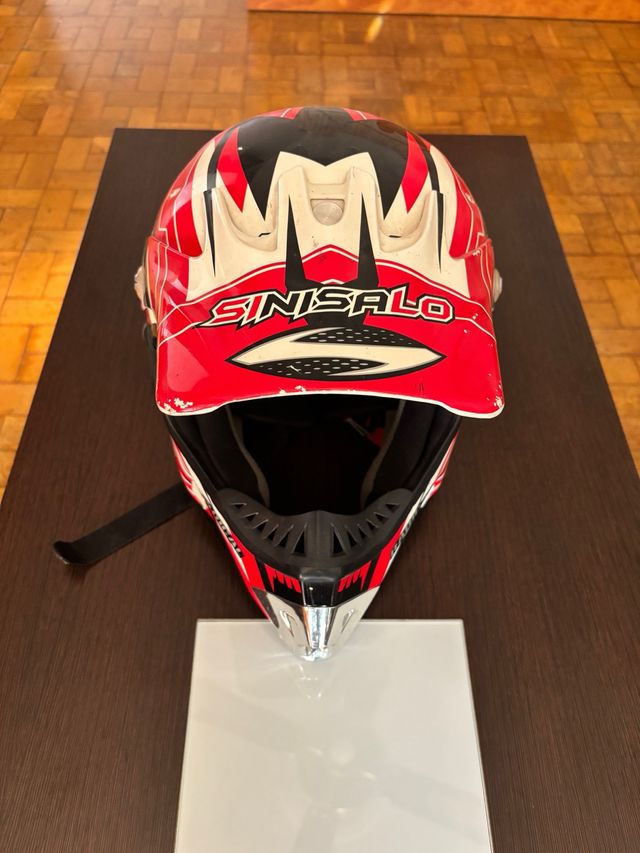 Casco de moto para enduro con un diseño llamativo en rojo y blanco. - Talla M. - Marca SINISALO. - Diseño deportivo. -Usado. - Precio original: 300€