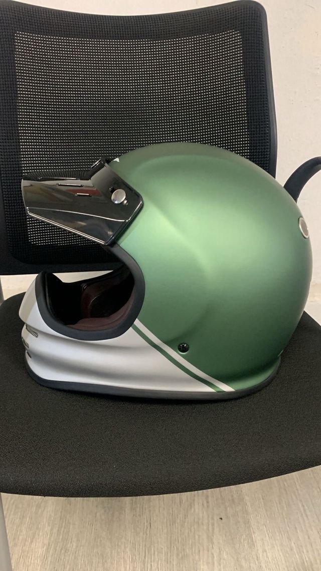 Casco de moto con un diseño distintivo en verde y plata. - Visera oscura. - Detalles de líneas verdes. Es nuevo . café racer caferacer Arai shoei hjc evo