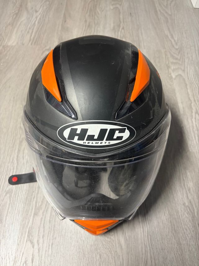 Casco de moto HJC con detalles en naranja. Ideal para protegerte en tus trayectos.