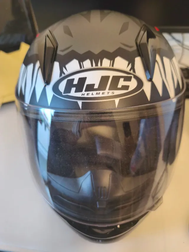 Casco de moto infantil con un diseño llamativo de tiburón. - Diseño con dientes de tiburón en blanco y negro. - Visera transparente. - Marca HJC.