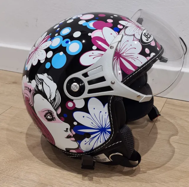 Detalles del productoCasco de moto de la marca Jeb's, talla M58. Presenta un diseño llamativo con flores y círculos en varios colores sobre fondo negro.