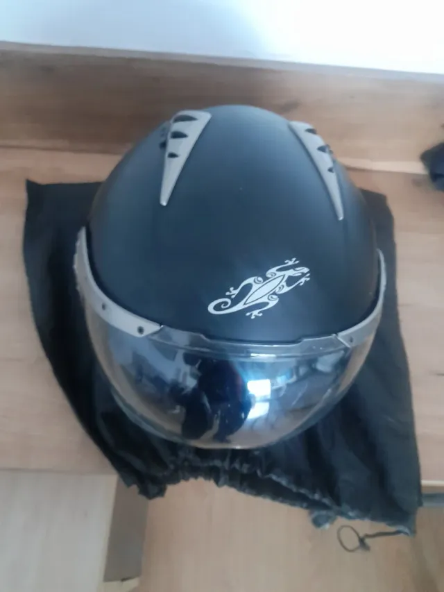Detalles del productoCasco de moto estilo Jet en color negro mate. Presenta un diseño moderno con detalles plateados y un gráfico de lagarto.