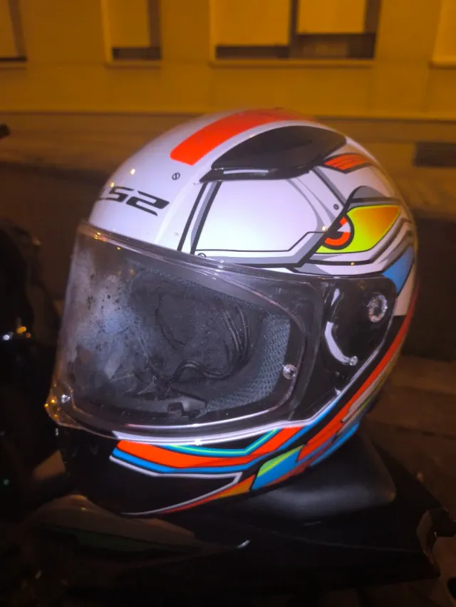 Detalles del productoCasco de moto LS2 con un diseño llamativo en blanco y naranja.