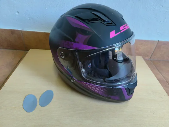 Casco de moto LS2 con un diseño llamativo en negro y detalles morados. Suplemento solar polarizado gris. Ventilación superior. Talla XS.