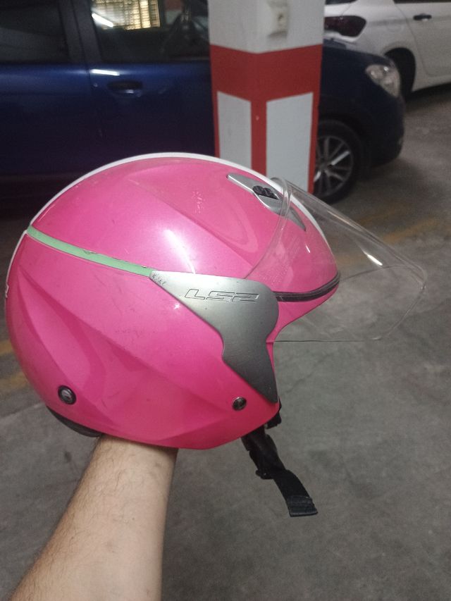 Casco de moto rosa con visera transparente. - Diseño moderno y llamativo. - Marca LS2. - Correa ajustable.