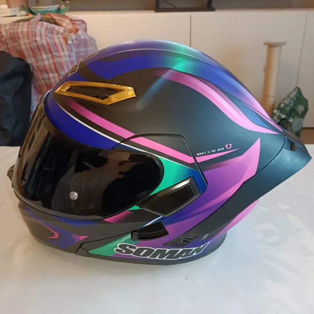 Casco de motorista Soman con un diseño llamativo y colorido. - homologación DOT - Talla S. - Visera oscura. - Detalles en dorado y morado. - abertura integral