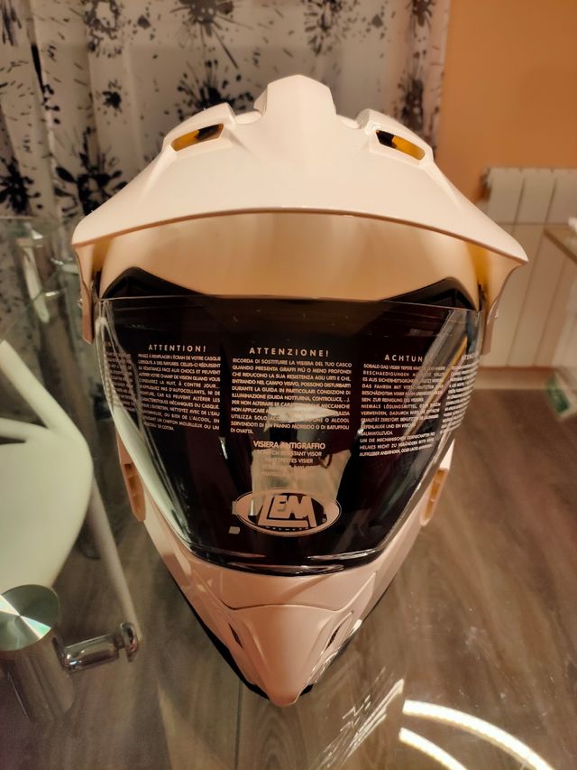Se vende estupendo casco para moto Trail, nuevo, no se ha usado, con pegatinas de protección, talla M, marca LEM. Su precio nuevo son 120 euros.
