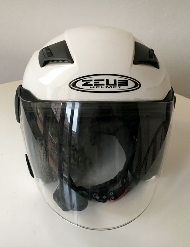 Detalles del productoCasco de moto marca Zeus en color blanco y con visera transparente.