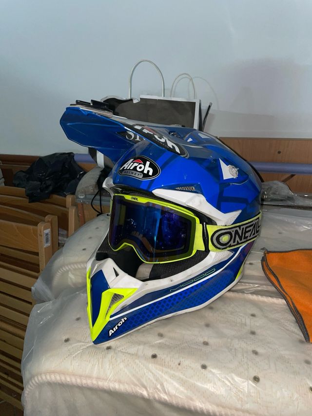Conjunto de casco de motocross Airoh y gafas Oneal. - Casco de motocross Airoh con diseño azul y blanco. - Gafas Oneal con lente azul.