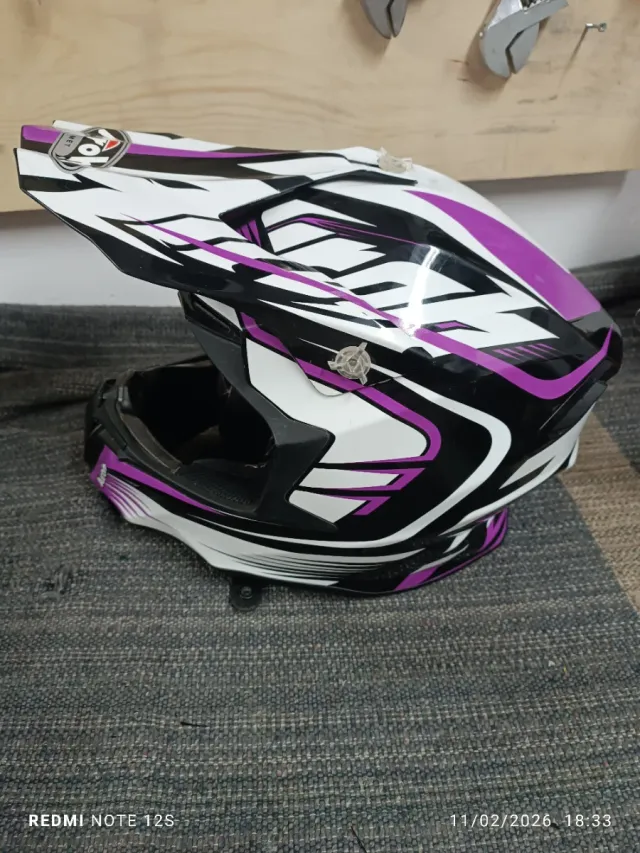 Casco de motocross Airoh con un diseño llamativo. - Talla S - Combinación de colores blanco y morado. - Visera aerodinámica.