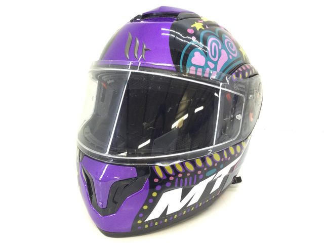 Casco integral MT Atom Axa con un llamativo diseño morado y decoraciones. E76815 - Diseño morado con detalles coloridos. - Visera transparente. -xs