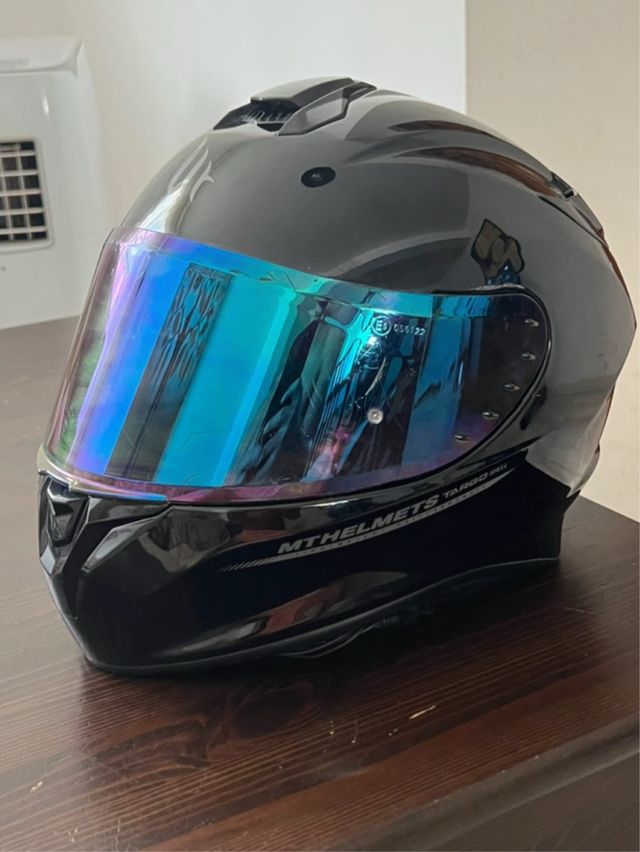 Vendo casco integral MT Helmets Targo, talla M (57-58 cm), en color negro brillante, con visera nueva efecto iridium (azul-morado, como se ve en la foto).