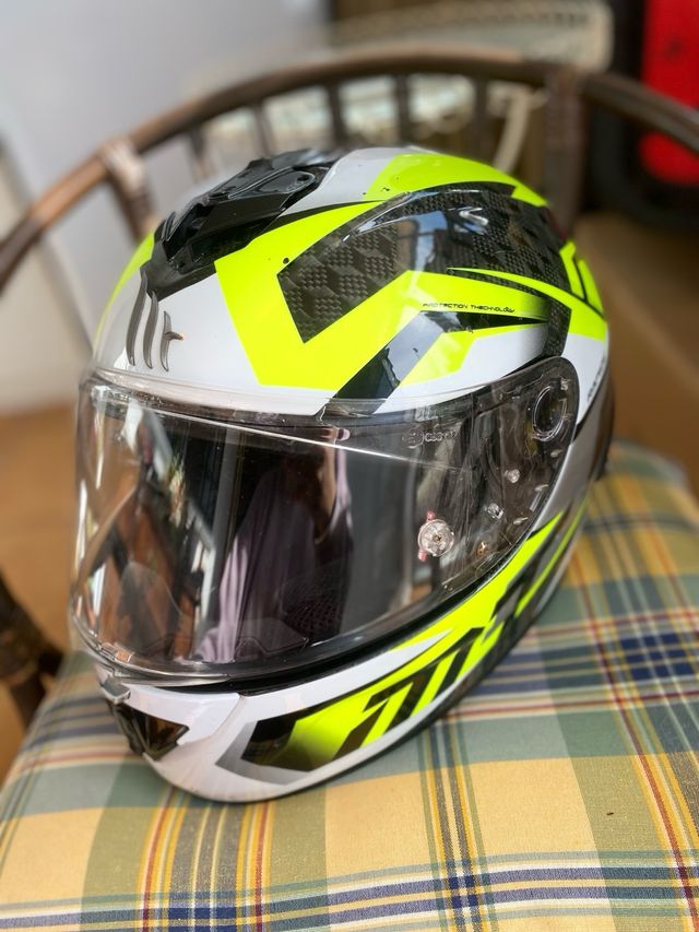 Casco integral MT Helmets Rapide Pro en talla L. Diseño llamativo en blanco, amarillo neón y detalles en carbono.