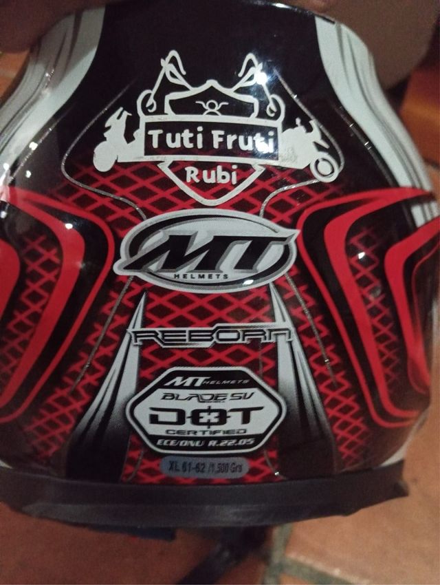 Casco de moto MT Tuti Fruti Rubi con diseño llamativo. - Modelo: Tuti Fruti Rubi - Talla: XL (61-62 cm) - Peso: 1.500 gramos - Certificación: ECE/ONU R.22.05