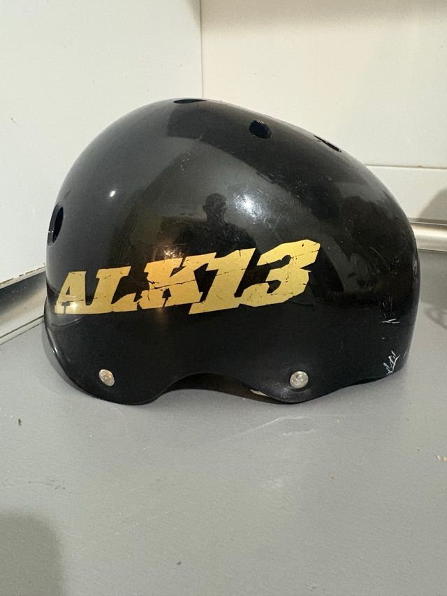 Casco protector de color negro con diseño llamativo. - Logo ALK13 en dorado. - Diseño tipo skate. - Múltiples orificios de ventilación.