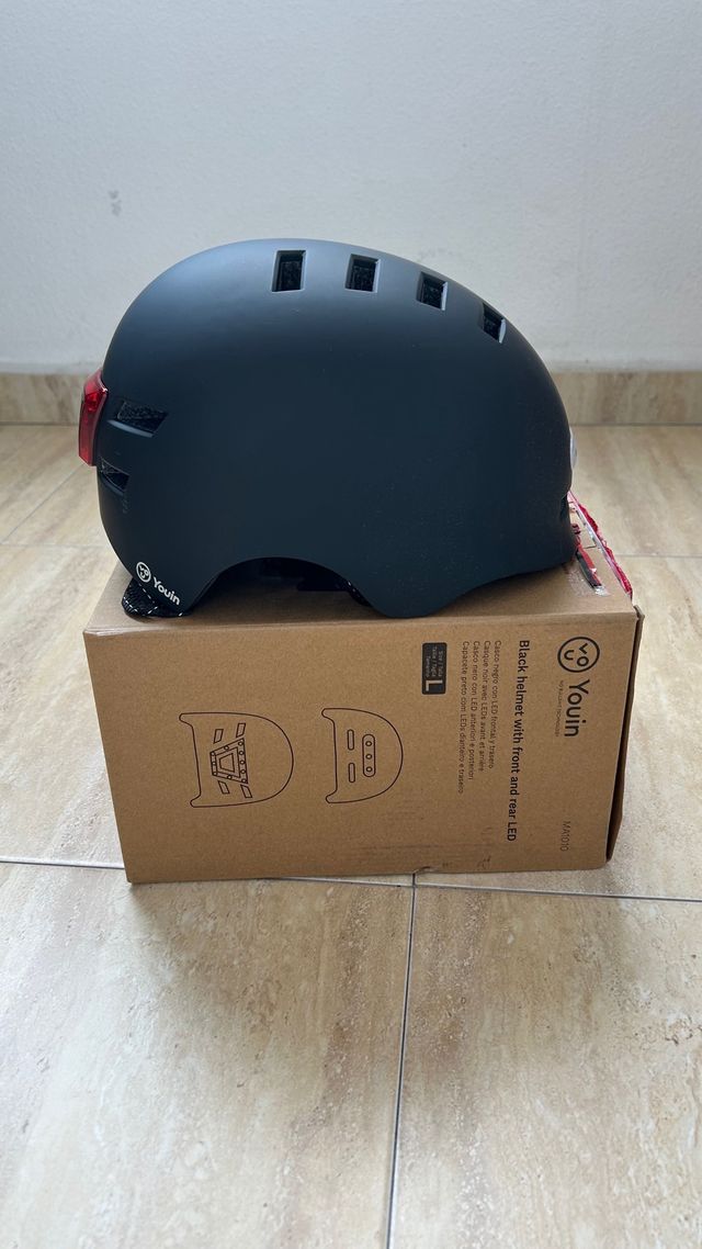 Detalles del productoCasco negro de la marca Youin, talla L, con luces LED delanteras y traseras.